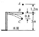 在跳水比赛中,有一个单项是“3m跳板”,其比赛过程可简化为:运动员走上跳板,跳板被压缩到最低点,跳板又将运动员竖直向上弹到最高点,运动员做自由落体运动,竖直落入水中.将运动员视为质点,运动员质量m=60kg,g=10m/s2,最高点A、跳板的水平点B、最低点C和水面之间的竖直距离如图所示。求: