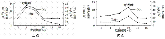 某实验小组在探究不同浓度 (μg/g)的乙烯对果实呼吸作用影响的实验中,得到如甲图所示结果。请回答下列问题。