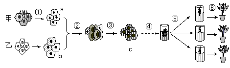 (1)①过程发生的化学变化是 w.w.^w.k.&s.5*;将若干a和b等量混合后转移到培养基上培养,再经过②和③,c的细胞类型有 ;在采用化学法进行过程②时,一般是用 作为诱导剂。植物体细胞杂交与自然状况下的生殖细胞杂交相比,前者的主要意义是 。