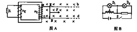 20.如下图A所示,足够长的光滑导轨ab、cd水平置于竖直向下的匀强磁场中,变压器为理想变压器。现用水平向右的恒力F使金属杆MN从静止开始向右运动。下列说法正确的是 ( )