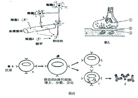 (4)图丙中所示的是 免疫过程。若图中抗原再次进入人体内,则a、b、c细胞中。能特异性识别该抗原的是 细胞。若该抗原为HIV,侵入人体后,攻击的主要对象是 细胞。