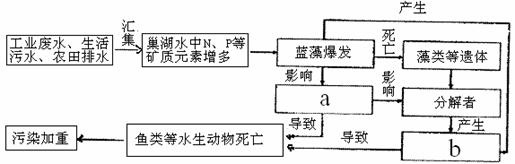 Ⅱ.近年来,巢湖在每年的梅雨季节,都会不同程度地发生水华(蓝藻爆发)现象,下面是发生水华现象时,巢湖生态系统中一些成分的关系图。请回答: