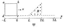 20. 如图甲所示,有一个等腰直角三角形的匀强磁场区域,其直角边长为L,磁场方向垂直纸面向外,磁感应强度大小为B。一边长为L、总电阻为R的正方形导线框abcd,从图示位置开始沿x轴正方向以速度υ匀速穿过磁场区域。取沿