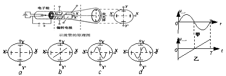 21. 利用示波器可以观察电压随时间的变化情况。其工作原理如图所示,电子经加速后进入偏转电场,在图甲、乙所示的竖直电压 uYY'、水平电压 uXX' 作用下打在荧光屏上,形成图形。下列关于偏转电压与所得图形的说法正确的是