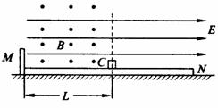 25.(18分)如图所示,MN是一固定在水平地面上足够长的绝缘平板(左侧有挡板),整个空间有平行于平板向右、场强为E=2N/C的匀强电场,在板上C点的左侧有一个垂直于纸面向外、磁感应强度为B=1T的匀强磁场,一个质量为m=4×10-3kg、带负电的小物块,带电量q=10-2C,从C点由静止开始向左先做加速运动再做匀速运动。当物体碰到左端挡板后被弹回,若在碰撞瞬间将电场改为竖直向下,大小不变。小物块返回时在磁场中恰做匀速运动,已知平板MC部分的长度为L=5m,物块与平板间的动摩擦因数为μ=0.2,求(结果均要求保留两位有效数字):