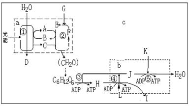 29. (7分)下图表示一个水稻叶肉细胞内发生的部分代谢简图。图中①-⑤表示反应过程,A-L表示细胞代谢过程中的相关物质,a、b、c表示细胞的相应结构。请据图作答: