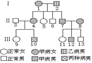 (3)已知II3不是乙病基因的携带者,则乙病的类型为 遗传病;III13的基因型为 ;若III9与III12结婚,生育的子女患病的概率为 。
