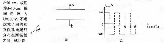 一段时间后进入一垂直于纸面向里的圆形匀强磁场区域(图中未画出)。第一个粒子飞出磁场后从上板左边缘平行于板面进入两个平行的金属板间,两金属板带等量异种电荷,粒子在两板间经偏转后恰从下板右边缘飞出。已知带电粒子的比荷q/m=2×106c/kg,重力不计,粒子进入磁场前的速度方向与带电板成p=60°角,匀强磁场的磁感应强度为B,带电板长为
