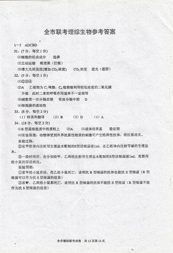 34、(18分)研究表明,S型肺炎双球菌细胞外的荚膜中含有一种毒蛋白,它可以使小鼠患败血症死亡:而R型肺炎双球菌细胞外没有荚膜,不能使小鼠患病。根据相关信息完成以下各题: