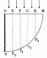 圆柱体棱镜的截面图,图中E、F、G、H将半径OM分成5等份,虚线EE1、FF1、GG1、HH1平行于半径ON。已知该棱镜的折射率n=
