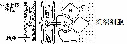 33.(7分)下图中A、B、C表示三种体液,①②③表示某些化学物质。请据图回答: