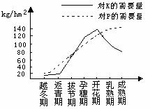 右图为小麦不同生长发育期对K、P的需要量曲线。若取得少肥、高效的结果,需将有限的磷钾复合肥用于