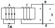 如图所示,线图C连接光滑平行导轨,导轨处在方向垂直纸面向里的匀强磁场中,导轨电阻不计,导轨上放着导体MN。为了使闭合线圈A产生图示方向的感应电流,可使导体MN: