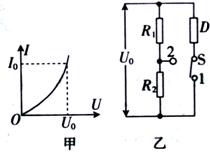 20.一个用半导体材料制成的电阻器D,其电流I随它两端电压U变化的伏安特性曲线如图甲所示。现将它与两个标准电阻R1、R2组成如图乙所示的电路,当开关S接通位置1时,三个用电器消耗的电功率均为P。将开关S切换到位置2后,电阻器D和电阻R1、R2消耗的电功率分别为PD、P1、P2,下列判断正确的是