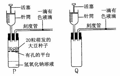 (5)环境温度不变,24小时后,装置P中的有色液滴移动了10个单位,装置Q中的有色液滴移动了2个单位,则该20粒萌发的大豆种子实际消耗的氧气为_______________个单位。