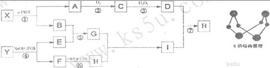 26.(12分)已知A、B、E是常见的非金属单质,其中A为淡黄色固体,Y是常见的金属单质,C的相对分子质量比A大32,D、G均是重要的工业产品,Y、F、H、I均含有同种元素。X含有两种元素,具有摇篮形的分子结构,球棍模型如图所示。I为白色胶状沉淀。图中部分反应条件和产物已略去。试回答下列问题