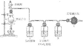 (2)将m g铁碳合金样品放入A中,再加入适量的浓硫酸。未点燃酒精灯前,A、B均无明显现象,其原因是: 。点燃酒精灯一段时间后,B中可观察到的明显现象是 。D中盛放的试剂是 。