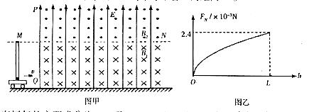 25.(18分)如图甲所示,水平地面上有一辆小车,小车上固定有竖直光滑绝缘管,管长为L0管内底部有一质量m = 0.2g,电荷量q = +8×10-5C的小球,小球的直径比管的内径略小。在管口所在水平面MN的下方存在着垂直纸面向里、磁感应强度B1 = 15T的匀强磁场,MN面上方存在着垂直纸面向外、磁感应强度B2 = 15T的匀强磁场,MN上下的整个区域还存在着竖直向上、场强E = 25V/m的匀强电场的。现让小车始终保持v = 2m/s的速度匀速向右运动,以带电小球刚经过场的边界PQ为计时的起点,测得小球对管侧壁的弹力FN随小球到管底的高度h的变化关系如图乙所示。g取10m/s2,不计空气阻力。求: