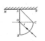 的四分之一圆弧,AB与水平屏幕MN垂直并接触于A点。由红光和紫光两种单色光组成的复色光射向圆心O,在AB分界面上的入射角
