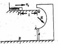 24.如图所示,水平轨道上轻弹簧左侧固定,弹簧处于 自然状态时,其右端位于P点,现用一质量m=0.1kg的小木块(可视为质点))将弹簧压缩后释放,物体经过P点时的速度,v0=18m/s,经过水平轨道右端Q点后恰好沿半圆轨道的切线进入竖直固定的圆轨道,最后物块经轨道最低点A抛出后落到点B,若物块与水平轨道的动摩擦因数μ=0.15 ,R=1m,A到B的竖直高度h=1.25m,取g=10m/s2