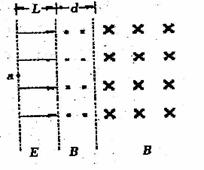 25.(18分)如下图所示,空间分布着有理想边界的匀强电场和足够大。的匀强磁场,左侧匀强电场的场强大小为E、方向水平向右,其宽度为L;中间区域匀强磁场的磁感强度大小为B、方向垂直纸面向外;右侧匀强磁场的磁感强度大小也为B、方向垂直纸面向里,一个带正电的粒子(质量m,电量q,不计重力)从电场左边缘a点由静止开始运动,穿过中间磁场区域进入右侧磁场区域后,又回到了a点,然后重复上述运动过程.求: