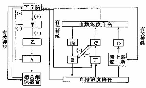 (2)当人体内的血糖浓度降低时,丁可直接感知血糖浓度的变化,也可接受下丘脑的控制,通过有关神经的作用,其分泌的___________________(填激素名称)增多;同时激素D也增多。