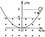 如图所示,一形状为抛物线的光滑曲面轨道置于竖直平面内,轨道的下半部处在一个水平向外的磁场中,磁场的上边界是