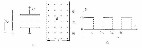 23.(20分)电子扩束装置由电子加速器、偏转电场和偏转磁场组成。偏转电场由加了电压的相距为d的两块水平平行放置的导体板形成,匀强磁场的左边界与偏转电场的右边 界相距为s,如图甲所示。大量电子(其重力不计)由静止开始,经加速电场加速后,连 续不断地沿平行板的方向从两板正中间射人偏转电场。当两板不带电时,这些电子通过两板之间的时间为2t0,当在两板间加如图乙所示的周期为2t0、幅值恒为U0的电压时,所有电子均从两板间通过,进入水平宽度为l,竖直宽度足够大的匀强磁场中,最后通过匀强磁场打在竖直放置的荧光屏上。问: