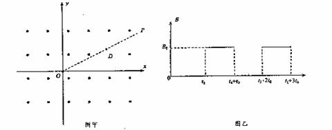 24.(24分)如图甲所示,x轴正方向水平向右,y轴正方向竖直向上。在xOy平面内有与y轴平行的匀强电场(电场区域足够大,图中未画出),现在垂直于xOy平面加一足够大的磁场(如图乙所示,设向外为磁场的正方向,B0知值)。在t=0刻,一个质量为m电量为q带正电小球,从坐标原点D处以v0度沿直线OP方向运动,为使小球能在以后的运动中垂直OP连线方向通过D(4L,3L)点,取g=10m/s2,求:
