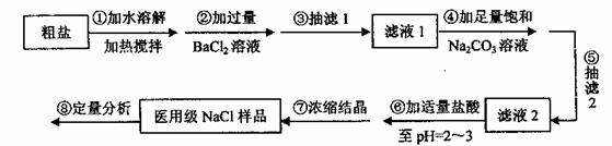 27.(16分)用粗盐(含Ca2+、Mg2+、SO42-、CO32-和泥沙等杂质)制备医用级纯度的NaCl,并测定医用NaCl的百分含量。某化学研究性学习小组成员设计了如下实验步骤: