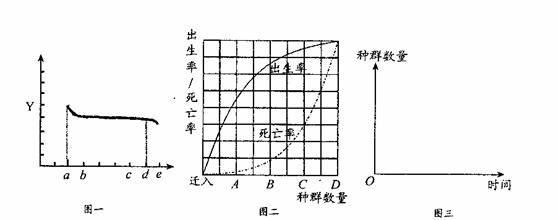 (4)此针阔混交林中,新迁入了一种野兔,图二为与这种野兔种群数量相关的出生率和死亡率的变化曲线。请在图三中画出野兔种群数量的变化曲线(将B、D标在纵坐标的合适位置上)。