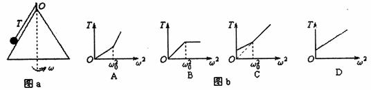 20、用一根细线一端系一小球(可视为质点),另一端固定在一光滑锥顶上,如图a所示,设小球在水平面内作匀速圆周运动的角速度为ω,线的张力为T,则T随ω2变化的图象是图b中的 ( )
