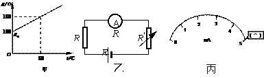 (1)如图(甲)是由某金属材料制成的电阻R随摄氏温度t变化的图象,若用该电阻与电池(电动势E=1.5V,内阻不计)、电流表(量程为5mA、内阻Rg=100Ω)、电阻箱R′ 串联起来,连接成如图(乙)所示的电路,用该电阻做测温探头,把电流表的电流刻度改为相应的温度刻度,就得到了一个简单的“金属电阻温度计”。