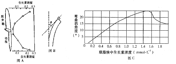 4.玉米种子在黑暗中萌发,测定胚芽鞘与幼根中各部分生长素含量如图A所示。切除玉米胚芽鞘的顶端,然后在其左侧放置含有不同浓度生长素的琼脂块,保持在黑暗中12h。胚芽鞘可能向右弯曲,弯曲角度如图B所示。下列有关说法正确的是 ( )