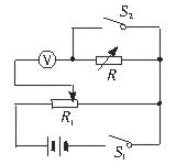 c.合上开关S1并打开S2,调整电阻箱R的阻值及变阻器R1的大小,使电压表的指针指到满偏的一半; 来源: