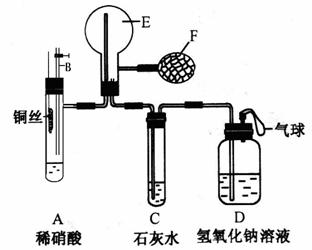 26.(15分)为了证明铜与稀硝酸反应产生的是NO,某校学生实验小组设计了一个实验,其装置如图所示(加热装置和固定装置均已略去)。B为一带有旋塞的导管,E为一个空的蒸馏烧瓶;F是用于鼓入空气的打气球。![]()