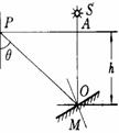 的液面上有一点光源S,发出一条光线,垂直地射到水平放置于液体中且距液面高度为h的平面镜M的O点上,当平面镜绕垂直于纸面的轴O以角速度ω逆时针方向匀速转动时,液面上的观察者跟踪观察,发现液面上有一光斑掠过,且光斑到P点后立即消失,求: