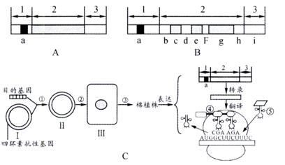 (3)图C中的III是导入目的基因的受体细胞,经培养、筛选获得一株有抗虫特性的转基因植株。经分析,该植株含有一个携带目的基因的DNA片段,因此可以把它看作是杂合子。理论上该转基因植株自交F1代中仍具有抗虫特性的植株占植株总数的 ,原因是 。