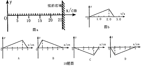 18.将一根长为 100 多厘米的均匀弦线,沿水平的 x 轴放置,拉紧并使两端固定,如图(a)所示。现对离右端固定点25cm 处(取该处为原点O)的弦上一点施加一个沿垂直于弦线方向(即y轴方向)的扰动,其位移随时间的变化规律如图(b)所示。该扰动将沿弦线传播而形成波(孤立的脉冲波)。己知该波在弦线中的传播速度为2cm/s,下图中表示自o点沿弦向右传播的波在t=2.5s时的波形图是( )