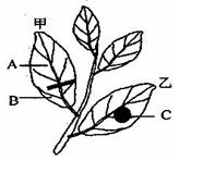 若人将某植株一片叶的主脉切断(右图中甲),另一片叶两面都贴上不透明的锡箔纸(右图中乙),黑暗中放置24小时后光照4小时。取下两叶经脱色后用碘液处理,发现A部位里棕褐色,B部位呈蓝黑色,C部位不呈蓝黑色。以上实验能够证明光合作用需要