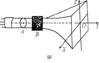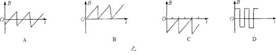 图甲是电视机的显像管的结构示意图,荧光屏平面位于坐标平面OXZ,y轴是显像管的纵轴线。位于显像管尾部的灯丝被电流加热后有电子逸出,这些电子在加速电压的作用下以很高的速度沿Y轴向+Y方向射出,构成了显像管的“电子枪”,如果没有其他力作用,从电子枪发射出的高速电子将做匀速直线运动打到坐标原点O,使荧光屏的正中间出现一个亮点。当在显像管的管颈处的较小区域(图中B部分)加沿Z方向的磁场(偏转磁场),亮点将偏离原点O而打在X轴上的某一点,偏离的方向和距离大小依赖于磁场的磁感应强度B。为使荧光屏上出现沿X轴的一条贯穿全屏的水平亮线(电子束的水平扫描运动),偏转磁场的磁感应强度随时间变化的规律应是图乙中的( )