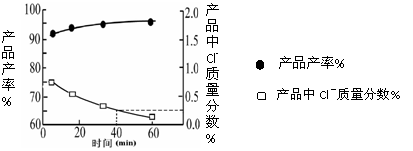 KH2PO4(aq)+HCl(aq),当反应时间不同时,产品产率和产品中Cl‑含量变化情况如图所示.KDP晶体的一级品标准:Cl-质量分数低于0.2%.