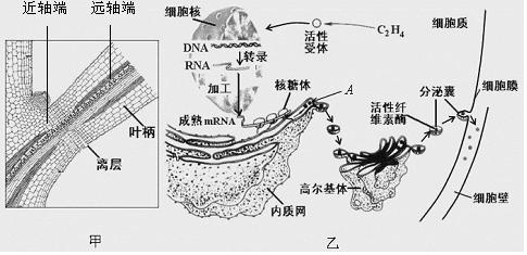 Ⅰ、(6分)秋末植物的叶片衰老时,在叶柄基部开始形成离层(如甲图所示),而后从植物体上脱落。离层部位细胞相关的生命活动如图乙所示。请据图回答下列问题: