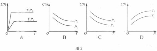 13.如图2所示,反应3A(g)+B(g) 2C(g)△H<O,随不同温度(T1>T2)、不同压强(P2>P1)或不同时间(t),混合气中C的体积分数C%变化的曲线中.下列图像错误的是 ( )