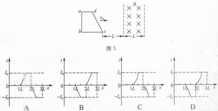 19.如图5所示,直角梯形线圈abcd,ab=bc=L,ad=L/2,线圈总电阻为R,右侧有一个宽度为L的有界磁场,磁感应强度大小为B,方向垂直纸面向里。初始时,c点距磁场左边界距离为L,线圈以恒定速率v0垂直磁场边界向右运动,穿过磁场区域。设逆时针方向电流为正.