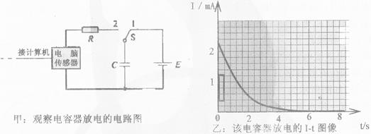 掷向2,电容器通过电阻R放电,计算机屏幕上显示出电流随时间变化的I-t曲线,如乙图所示。则:在乙图中画出了一个竖立的狭长矩形(在乙图的左端),它的面积的物理意义是: