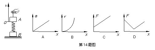 14、 质量为m的物体B置于地面上 ,通过一劲度系数为k的轻弹簧与物体A相连,开始时A、B都处于静止状态,如图所示.现通过细绳将物体A向上匀加速提升,到B刚要离开地面,下列关于物体A的加速度a、速度v、细绳拉力F与物体A的坐标x关系的图像,(假设弹簧一直在弹性限度范围内,以A静止位置为原点,建立方向向上的x轴坐标.)正确的有( )