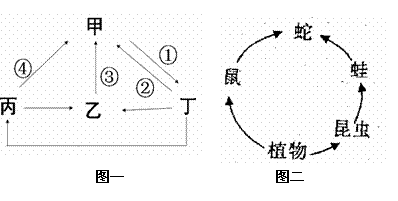 下图一表示自然界中碳循环简图,甲、乙、丙、丁代表生态系统的成分,①②③④代表生理过、