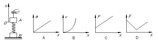 14、 质量为m的物体B置于地面上,通过一劲度系数为k的轻弹簧与物体A相连,开始时A、B都处于静止状态,如图所示.现通过细绳将物体A向上匀加速提升,到B刚要离开地面,下列关于物体A的加速度a、速度v、细绳拉力F与物体A的坐标x关系的图像,(假设弹簧一直在弹性限度范围内,以A静止位置为原点,建立方向向上的x轴坐标).正确的有( )