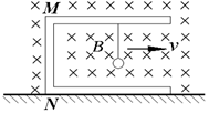 16.如图所示为用足够宽的铝板制成的匚形框的主视图,一质量为m且带电的小球用绝缘细线悬挂在上板的中点处,整个装置置于匀强磁场中,磁感线方向沿水平方向并与匚形框的MN板垂直,匚形框正以速度v向右匀速运动,若悬线拉力为T,则( )